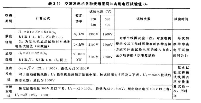 ②各種繞組沖擊耐電壓試驗值見表3-15。