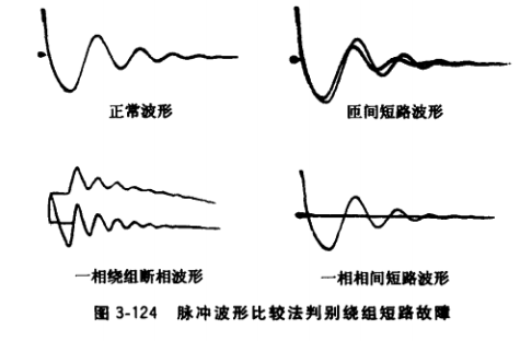 ③繞組匝間短路判別。可采用“脈沖波形比較法”,圖3-124列出幾種匝間絕緣耐電壓試驗波形圖及對絕緣的判斷,供參考。