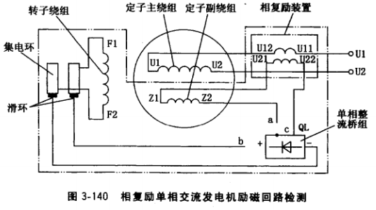 圖3-140雙點劃線框內部分為這種發電機勵磁回路,包含定子副繞組、相復勵裝置二次繞組、單相整流橋組、集電環、轉子繞組及各段連接線。檢測前先拆開單相整流橋組交、直 流側各一個接點,然后按以下順序檢測: