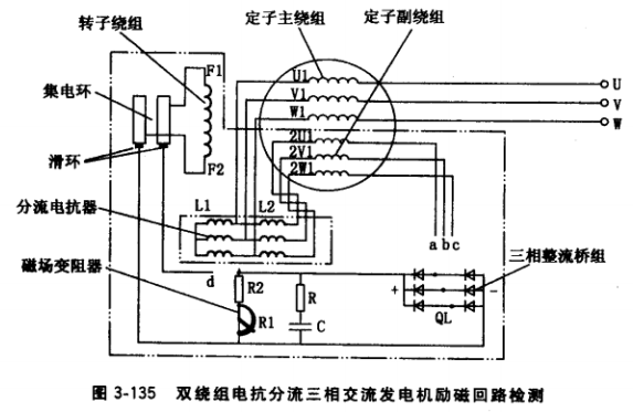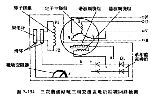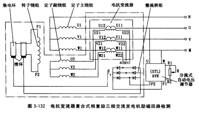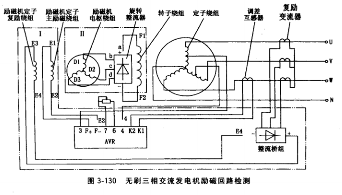 圖3-129中雙點劃線框內部分為這種發電機勵磁回路,它包括U相定子繞組、AVR (或整流橋組)、集電環、轉子繞組F1F2及各段連接線。