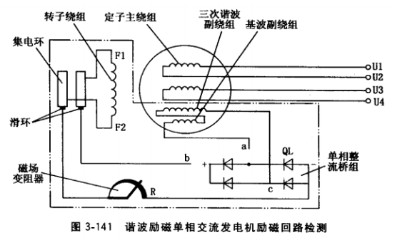 圖3-141雙點劃線框內部分為這種發電機勵磁回路,包含定子三次諧波副繞組、定子基波副繞組、單相整流橋組、磁場變阻器、集電環、轉子繞組及各段連接線。檢測前先拆開單相整流橋組交、直流側各一個接點,然后按以下順序檢測: