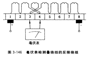 (2)用毫伏表探測繞組接地點。在圖3-143b中,直流低壓仍加于片1、9,毫伏表一端接地,另一端由片1或9開始逐片測量對地電壓,由于越接近接地點,繞組對地電壓越低, 當毫伏表指示的電壓接近零時,該換向片所連接的繞組疑為接地繞組。再繼續測貴以下各片對地電壓,若毫伏表讀數又逐片大起來,則可斷定對地電壓接近零的換向片所連接的繞組 接地。