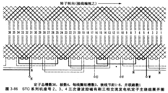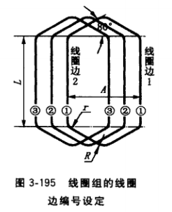 為了便于了解和操作,設定圖3-195疊式線圈組中右邊為線 圈邊1,左邊為線圈邊2,并按規定的嵌線后定子繞組出線端, 面對出線端把定子鐵心槽從1號按順時針方向編到36號。