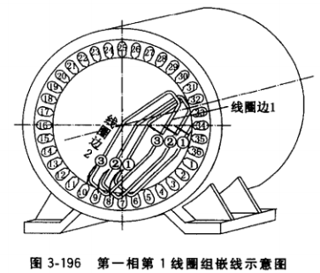 繞組嵌線從第一相開始,第一相第1線圈組的3個線圈邊2嵌入定子鐵心8、9、10號槽(見圖3-196),及時插入層間絕緣,此時該線圈組的3個線圈邊1 應懸掛在1、2、3號槽口上方。接著,嵌第二相第1線圈組,將其線圈邊2嵌入定子鐵心11、 12、13號槽,插入層間絕緣,該線圈組的線圈邊1應懸掛在4、5、6號槽口上方。繼而嵌第三相第1線圈組,將其線圈邊2嵌入定子鐵心14、 15、16號槽,插入層間絕緣,該線圈組的線圈 邊1應懸掛在7、8、9號槽口上方。之后繼續按上述方法嵌第一相的第2線圈組的線圈邊2于 17、18、19號槽中。由于前面8號槽起已有線圈邊2嵌入槽下層,此時第一相第2線圈組的線圈邊1可嵌入10、11、12號槽。接著,按槽順序嵌人第二相、第三相線圈邊2和線圈邊1, 直至每相的第3線圈組、第4線圈組均按順序嵌入相應槽中。